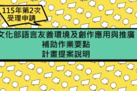 申請時間:115年4月1日-4月30日 … 閱讀全文 文化部「語言友善環境及創作應用與推廣補助作業要點」115年第2次申請開始受理囉!