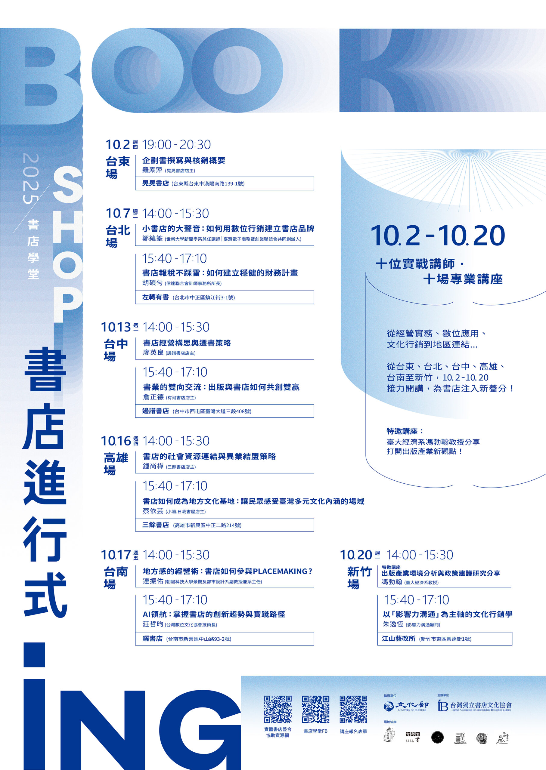 從讀者支持實體書店的心意,到講師與作者的用心分享,再到書友們的真誠回饋,這些力量正是推動「書店進行式」不斷向前的動能。我們將於北、中、南、東舉辦十加一場講座,聚焦書店日常經營的實務,與面對未來挑戰所需的知識與方法,期待與您現場交流、相互啟發。