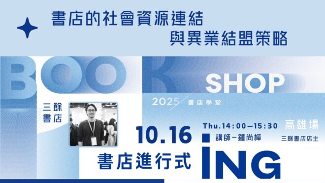【書店的社會資源連結與異業結盟策略】feat.鍾尚樺(三餘書店店主) 發佈日期: 2025 年 12 月 31 日 作者: Manager 分類: 書店學堂標籤: 2025書店學堂、三餘書店、鍾尚樺 #三餘書店 近期和 #高雄市立圖書館 合作「高雄市立圖書館獨書時光」是高雄市立圖書館過往曾舉辦的一系列講座活動,邀請高雄在地老字號書店的創辦人或二代經營者分享書店故事與文化。參與享讀福爾摩沙創新書市,以及結合民間企業的資源等,皆讓三餘有更多的能量舉辧不同活動,促使更多民眾參與。 這堂講座由三餘書店店主尚樺分享,希望激盪書店經營者更多想法,能連結更多社會資源,發揮更大影響力。